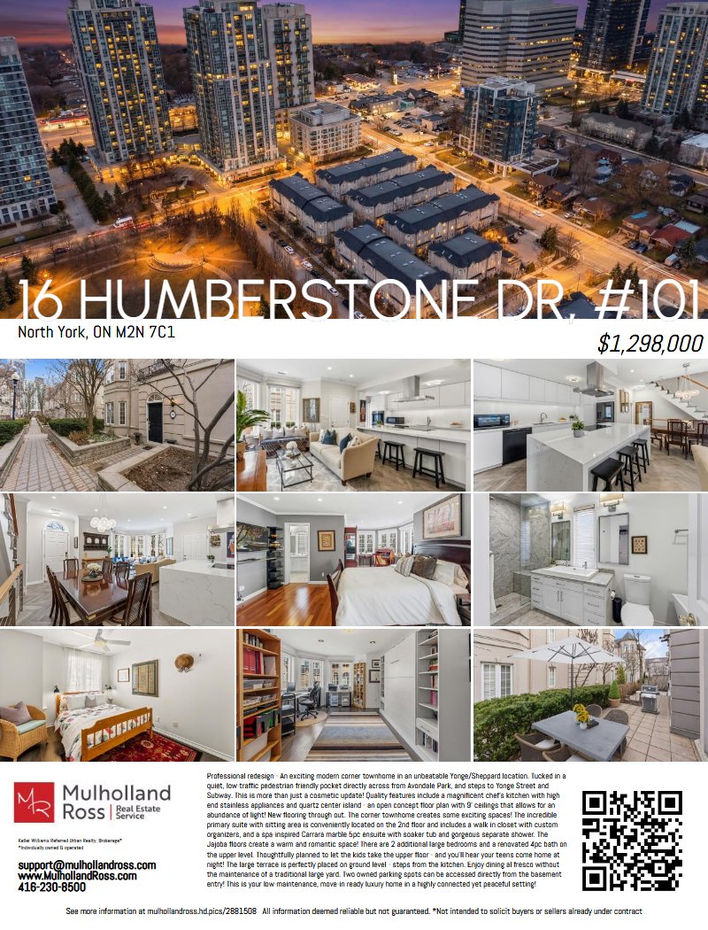 Professional redesign - An exciting modern corner townhome in an unbeatable Yonge/Sheppard location. Tucked in a quiet, low-traffic pedestrian friendly pocket directly across from Avondale Park, and steps to Yonge Street and Subway. This is more than just a cosmetic update! Quality features include a magnificent chef's kitchen with high end stainless appliances and quartz center island - an open concept floor plan with 9' ceilings that allows for an abundance of light! New flooring through out. The corner townhome creates some exciting spaces! The incredible primary suite with sitting area is conveniently located on the 2nd floor and includes a walk in closet with custom organizers, and a spa-inspired Carrara marble 5pc ensuite with soaker tub and gorgeous separate shower. The Jajoba floors create a warm and romantic space! There are 2 additional large bedrooms and a renovated 4pc bath on the upper level. Thoughtfully planned to let the kids take the upper floor - and you'll hear your teens come home at night! The large terrace is perfectly placed on ground level - steps from the kitchen. Enjoy dining al fresco without the maintenance of a traditional large yard. Two owned parking spots can be accessed directly from the basement entry! This is your low-maintenance, move-in ready luxury home in a highly connected yet peaceful setting!